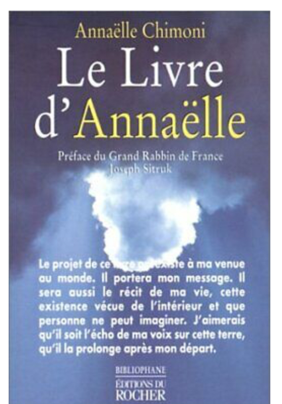 Annaëlle Chimoni, le livre n’est plus édité… Il mérite pourtant d’être connu, lu, entendu car « le projet de ce livre préexiste à ma venue. Il portera mon message. Il sera aussi le récit de ma vie, cette existence vécue de l’intérieur et que personne ne peut imaginer. J’aimerais qu’il soit l’écho de ma voix sur cette terre, qu’il la prolonge après mon départ ».
