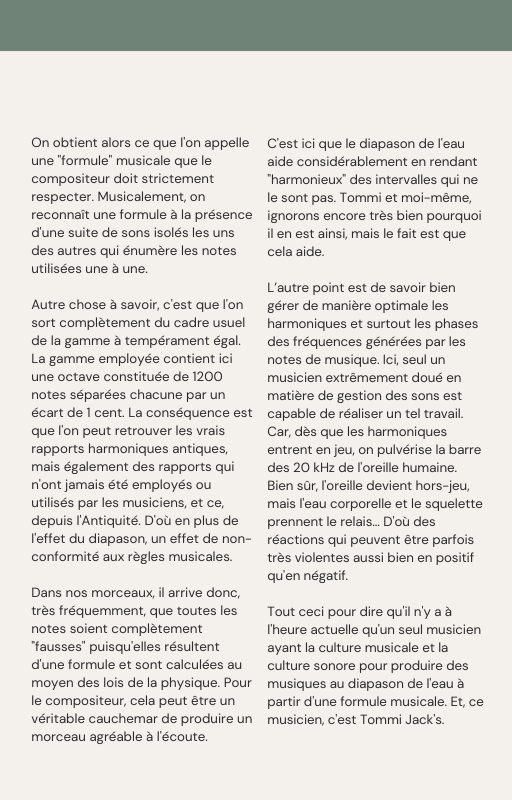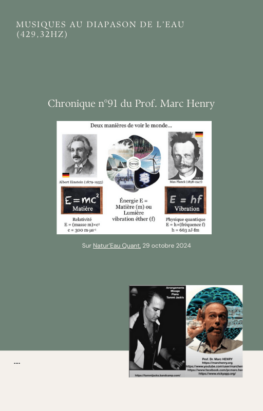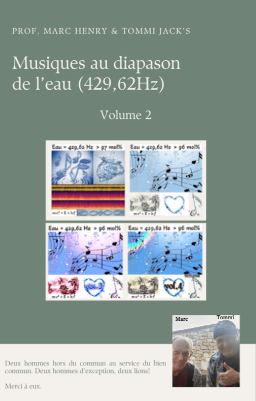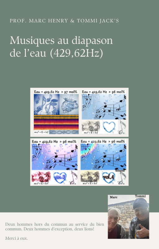 Le Professeur Marc Henry a voué plus de quarante années de sa vie à l’eau. Depuis fin 2022, avec Tommi Jack’s, musicien, compositeur et ingénieur du son, ils ont consacré leur temps à créer ces musiques en y mettant toute leur énergie et leurs compétences respectives. Chacun s’est mis à composer l’un, avec ses équations, l’autre avec ses harmoniques, pour fournir un travail expérimental hors du commun.