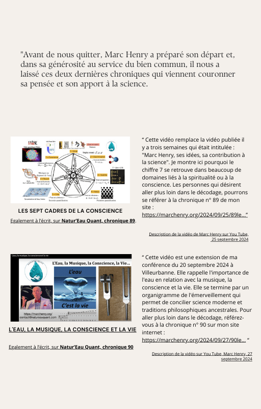 Ils ont été offerts aux membres du groupe Les Amis de l’Eau Morphogénique ainsi qu’à l’association de Marc Henry, Natur’Eau Quant et, après son décès, à l’Institut Marc Henry.