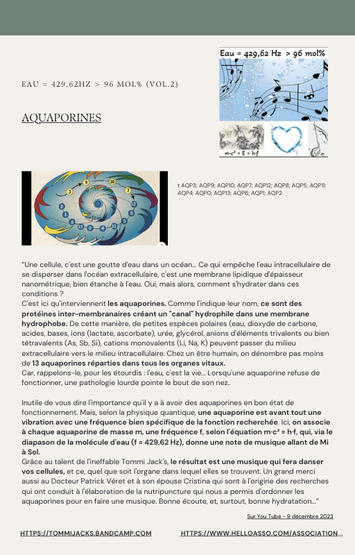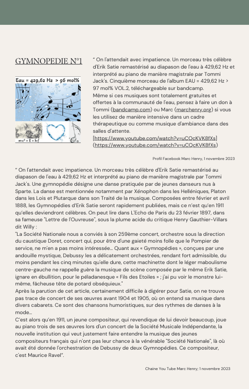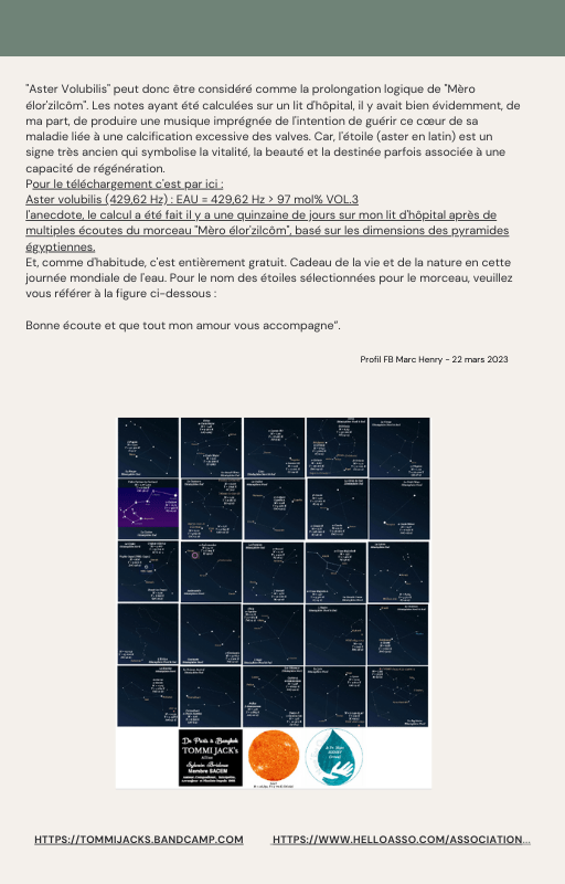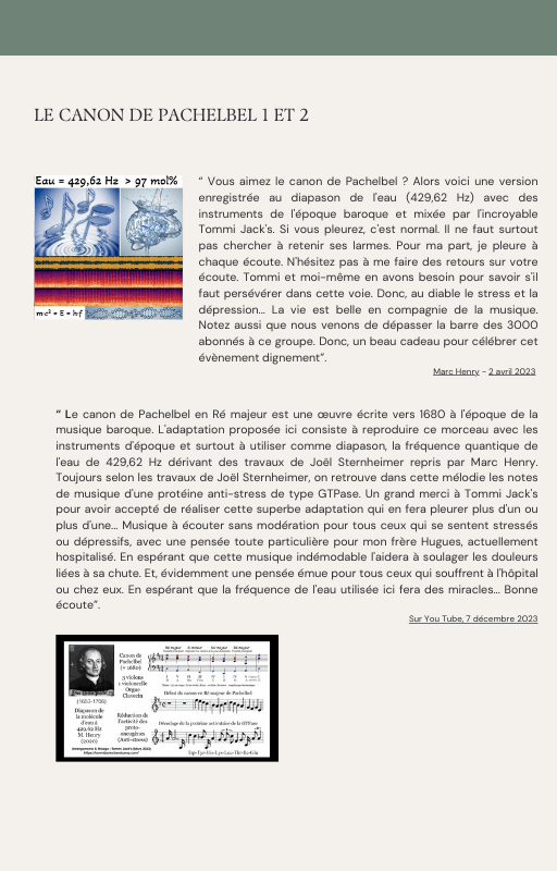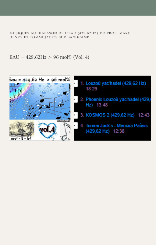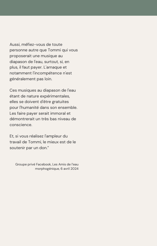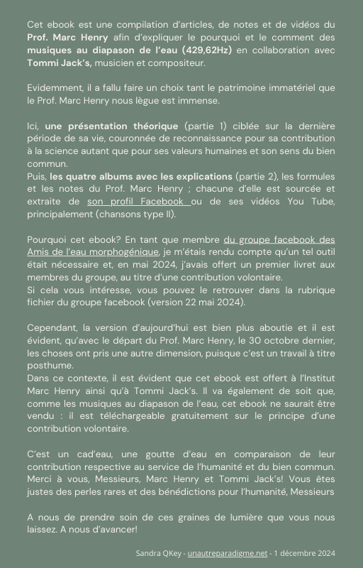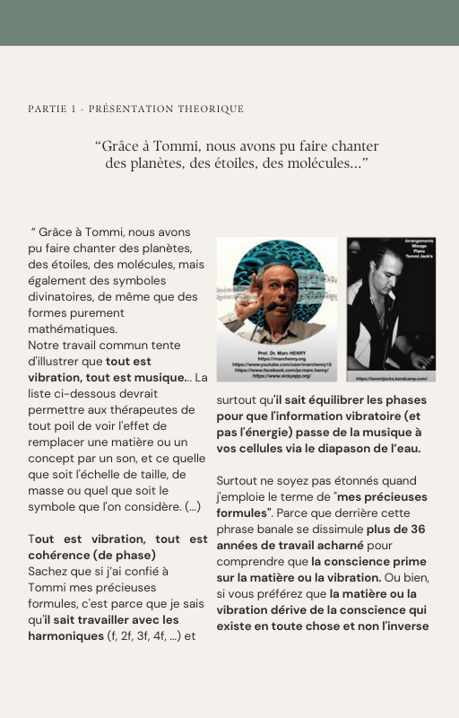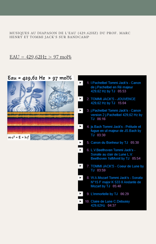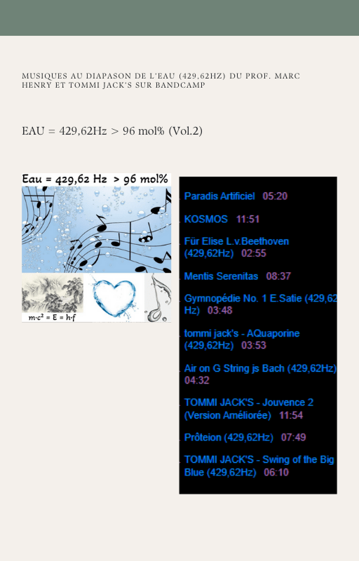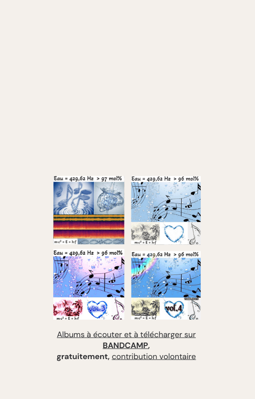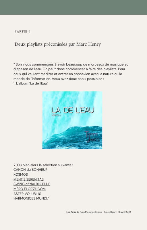 Pour rendre service à la communauté des Amis de l’eau morphogénique (le groupe privé Facebook de plus de 6000 membres où Marc Henry publiait quotidiennement) et parce qu‘intérieurement, j’étais animée à le faire, j’ai compilé les notes et les explications de Marc Henry et les ai mises en lien avec les musiques de Tommi sur la plateforme Bandcamp. En effet, avec le fil d’actualité, on s’y perdait et il devenait urgent de créer un document qui permette de centraliser les explications et les formules de Marc Henry à chacune des musiques de Tommi.