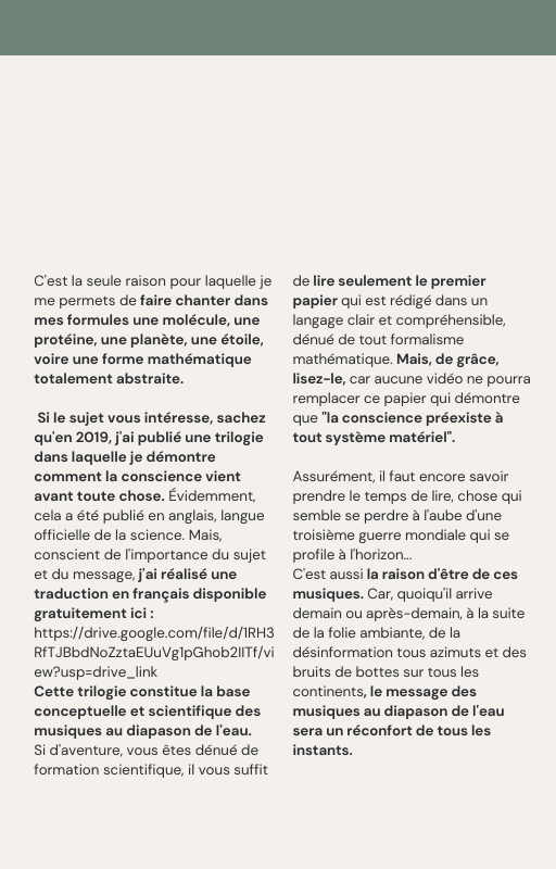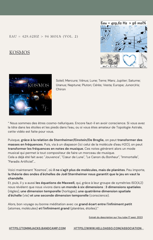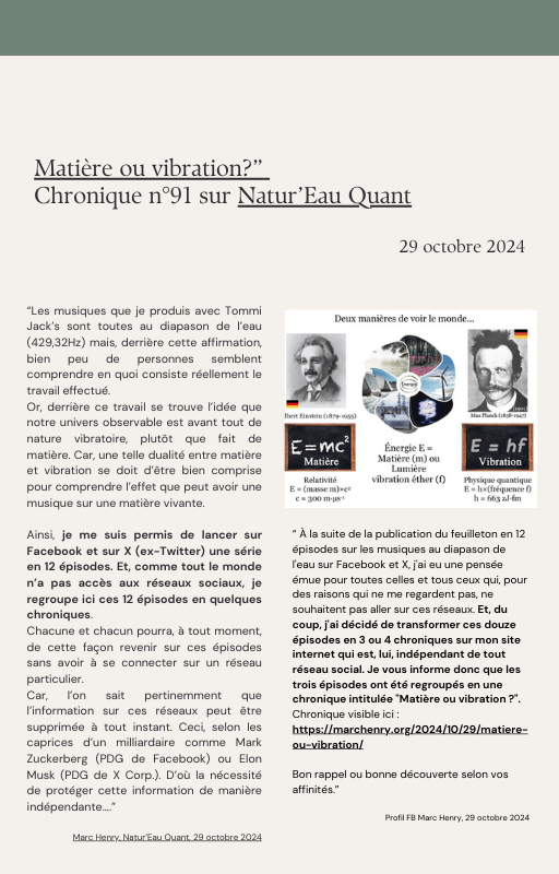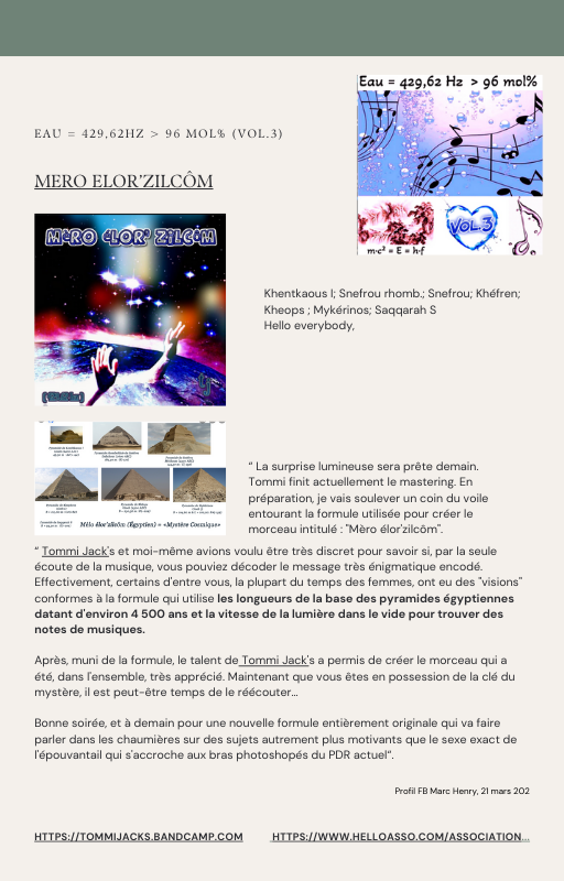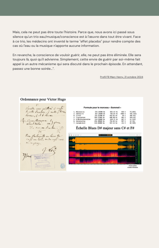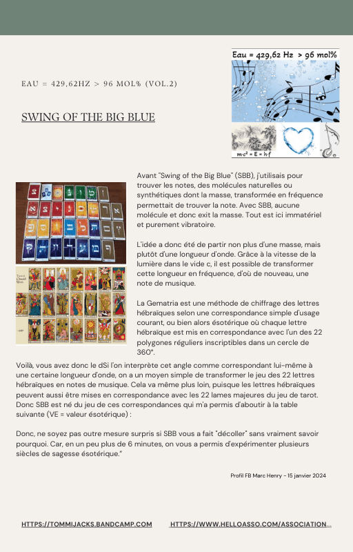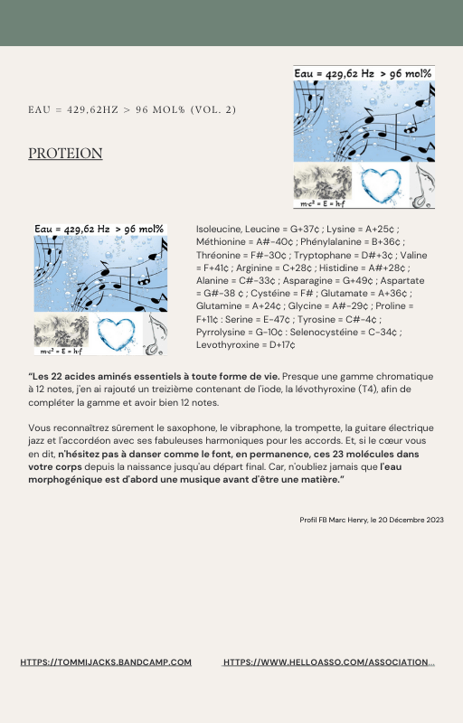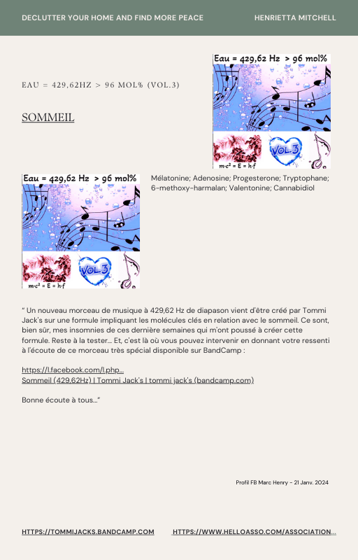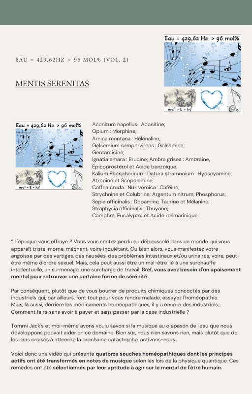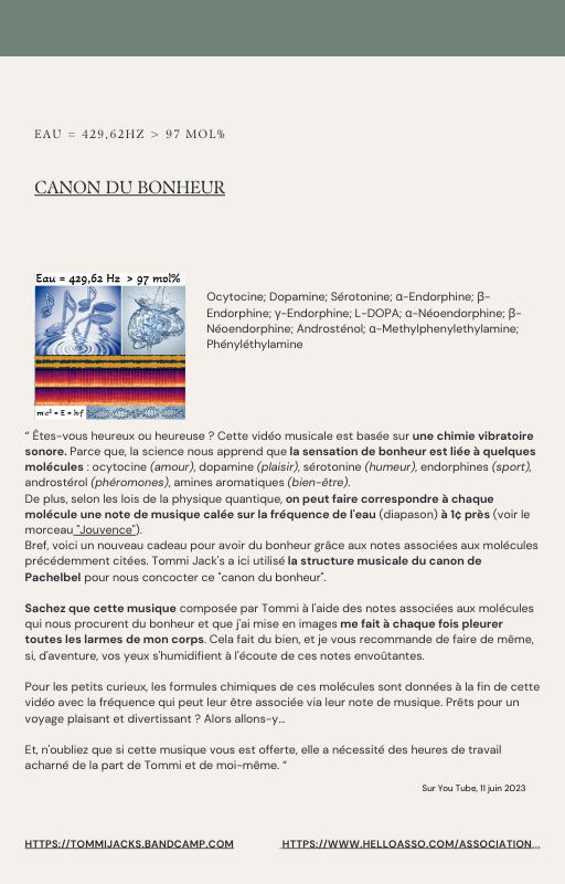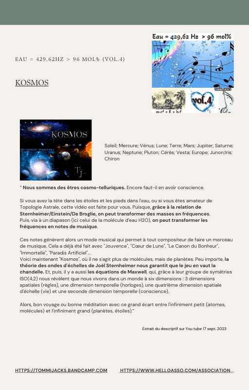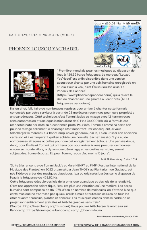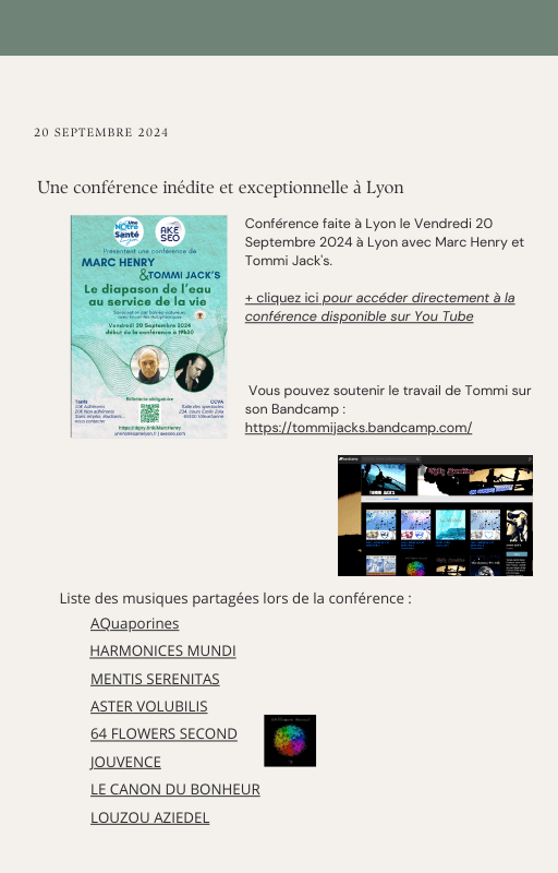 Pour rendre service à la communauté des Amis de l’eau morphogénique (le groupe privé Facebook de plus de 6000 membres où Marc Henry publiait quotidiennement) et parce qu‘intérieurement, j’étais animée à le faire, j’ai compilé les notes et les explications de Marc Henry et les ai mises en lien avec les musiques de Tommi sur la plateforme Bandcamp. En effet, avec le fil d’actualité, on s’y perdait et il devenait urgent de créer un document qui permette de centraliser les explications et les formules de Marc Henry à chacune des musiques de Tommi.