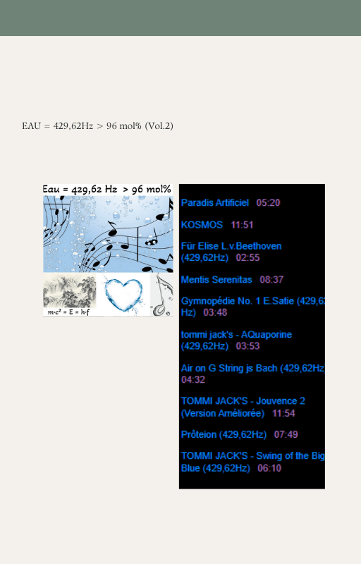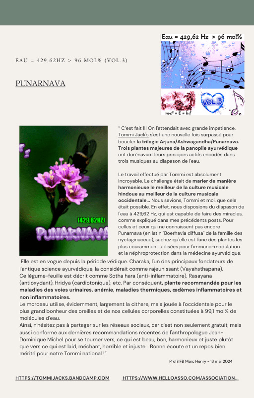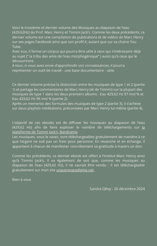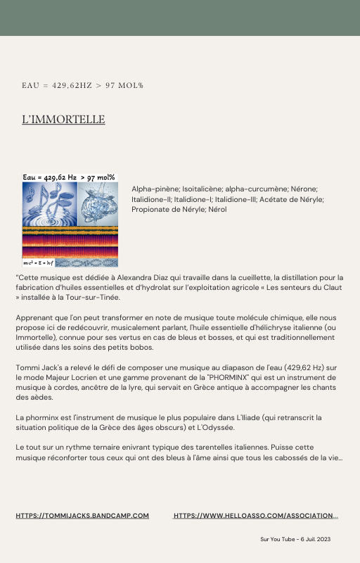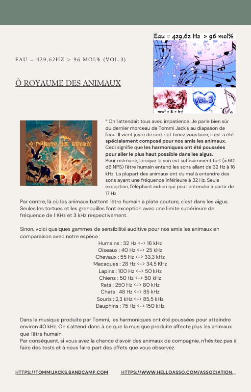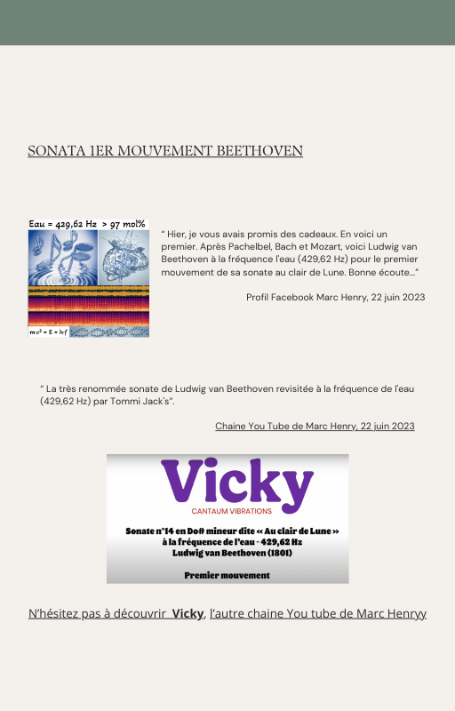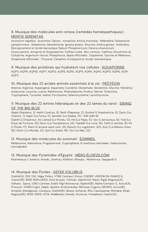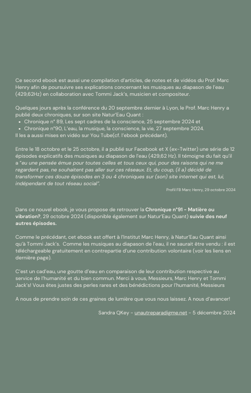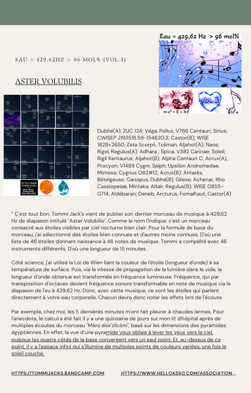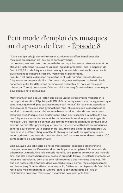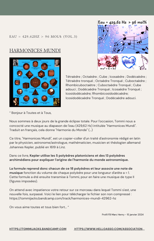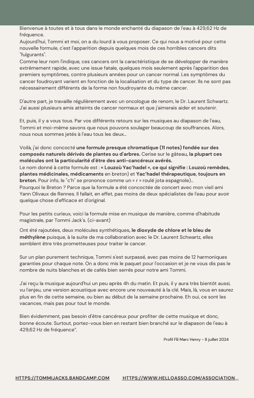 Pour rendre service à la communauté des Amis de l’eau morphogénique (le groupe privé Facebook de plus de 6000 membres où Marc Henry publiait quotidiennement) et parce qu‘intérieurement, j’étais animée à le faire, j’ai compilé les notes et les explications de Marc Henry et les ai mises en lien avec les musiques de Tommi sur la plateforme Bandcamp. En effet, avec le fil d’actualité, on s’y perdait et il devenait urgent de créer un document qui permette de centraliser les explications et les formules de Marc Henry à chacune des musiques de Tommi.