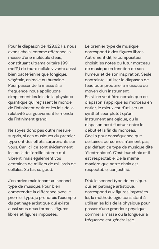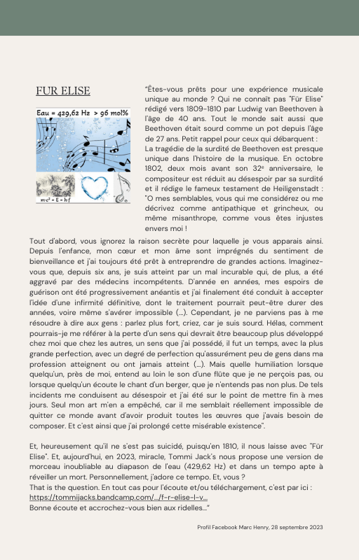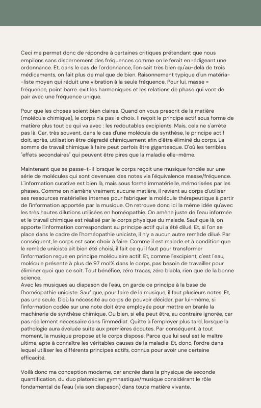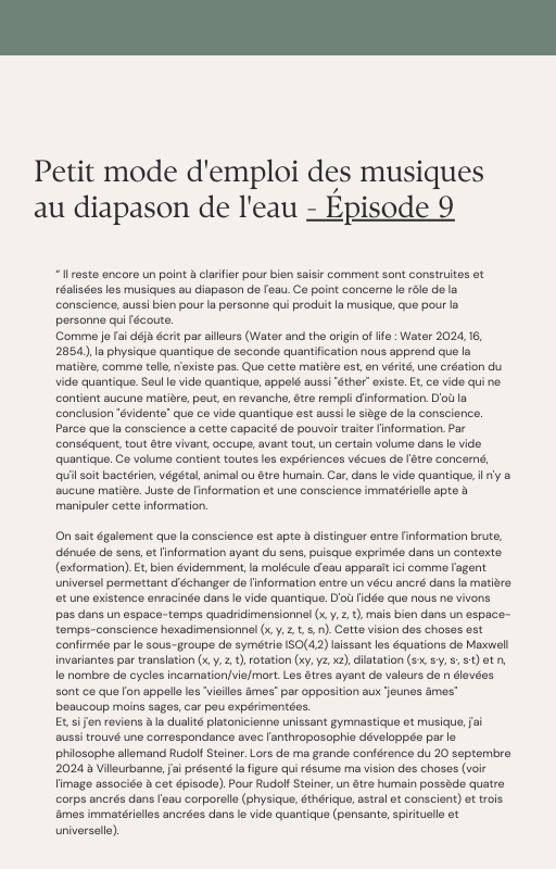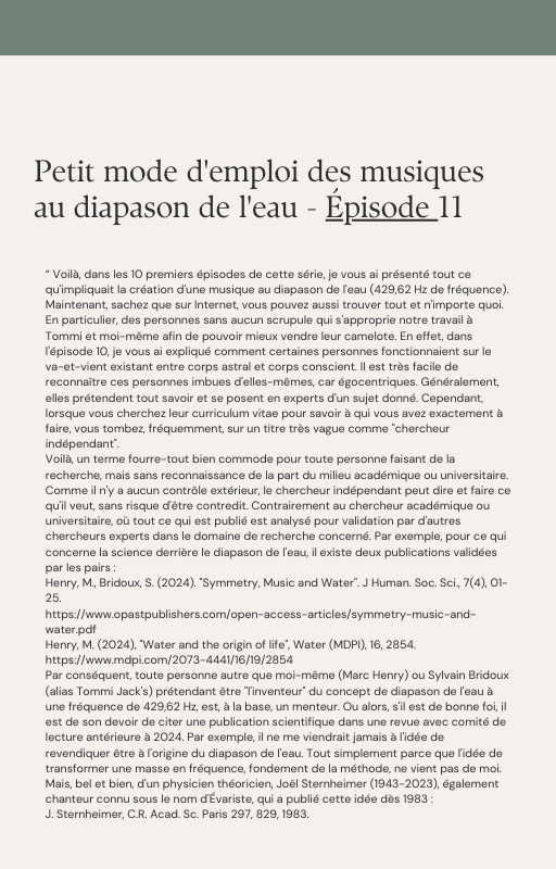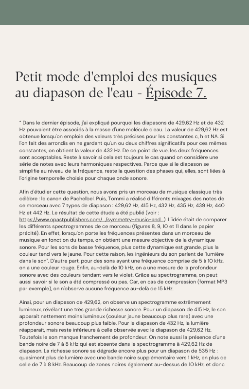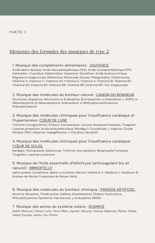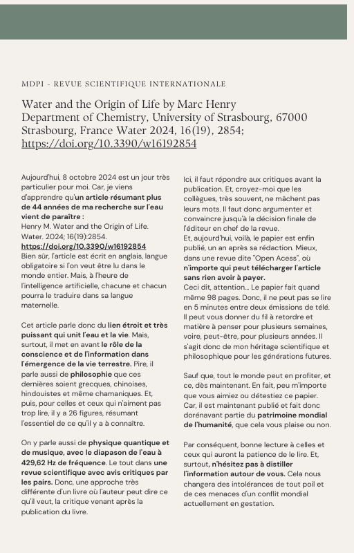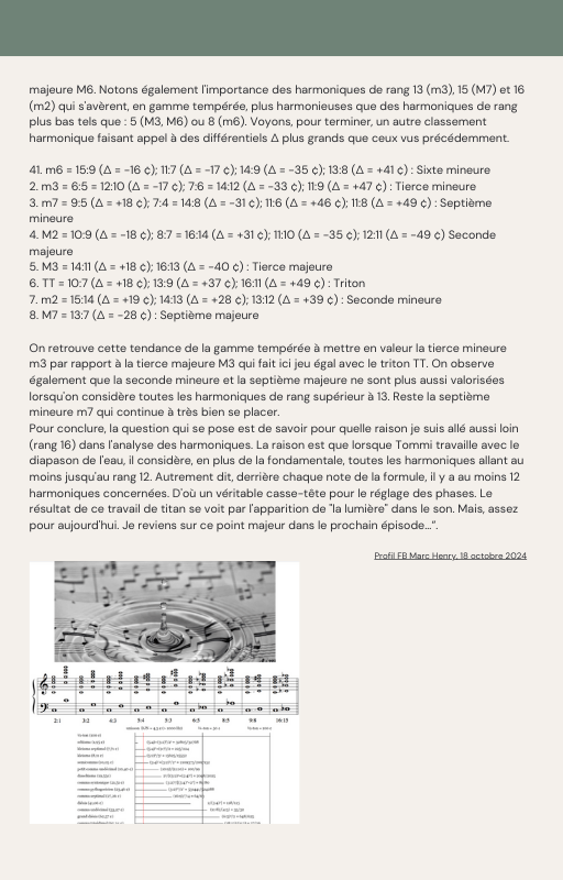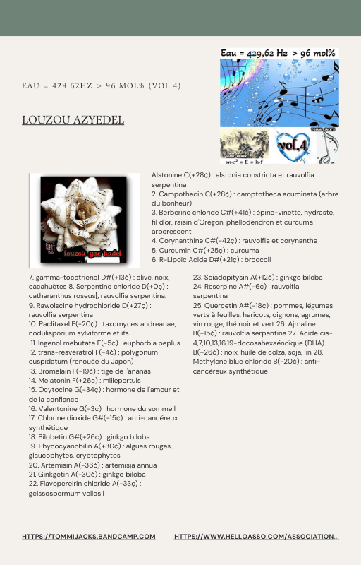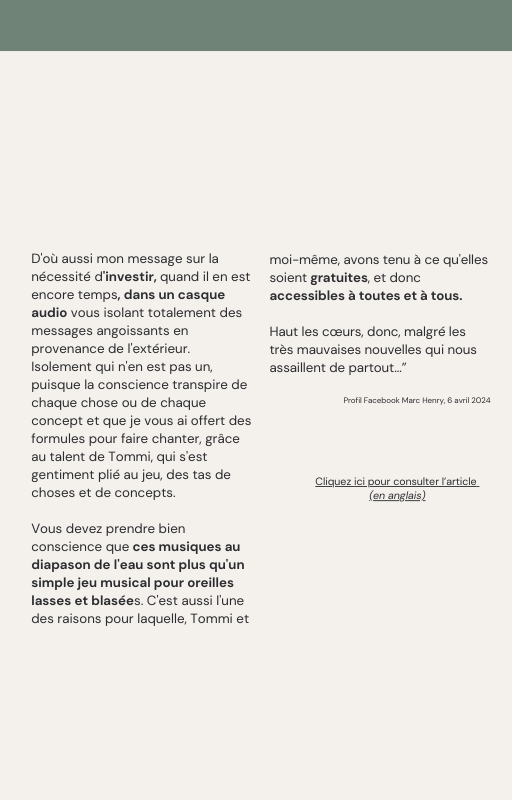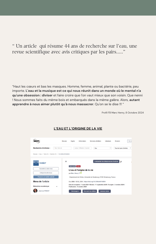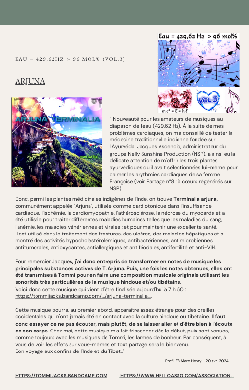 Pour rendre service à la communauté des Amis de l’eau morphogénique (le groupe privé Facebook de plus de 6000 membres où Marc Henry publiait quotidiennement) et parce qu‘intérieurement, j’étais animée à le faire, j’ai compilé les notes et les explications de Marc Henry et les ai mises en lien avec les musiques de Tommi sur la plateforme Bandcamp. En effet, avec le fil d’actualité, on s’y perdait et il devenait urgent de créer un document qui permette de centraliser les explications et les formules de Marc Henry à chacune des musiques de Tommi.