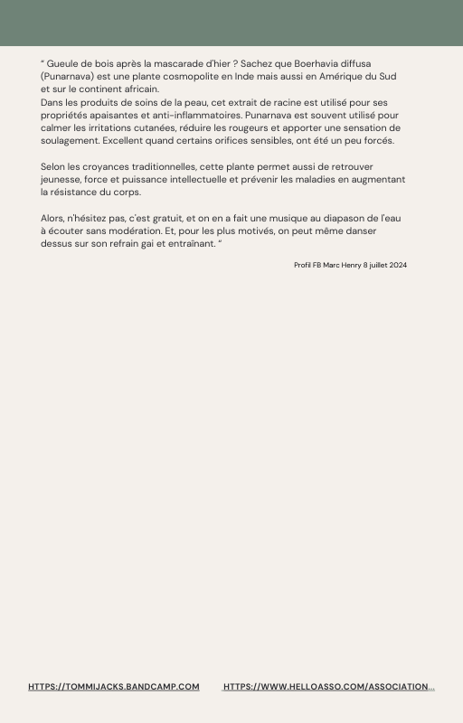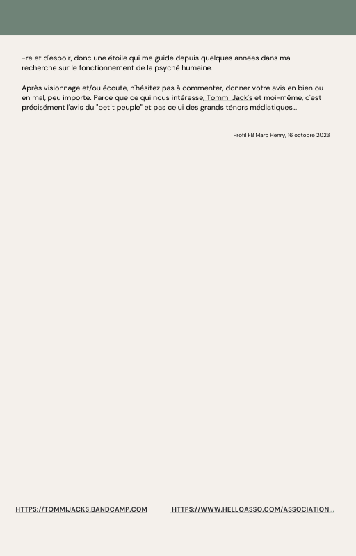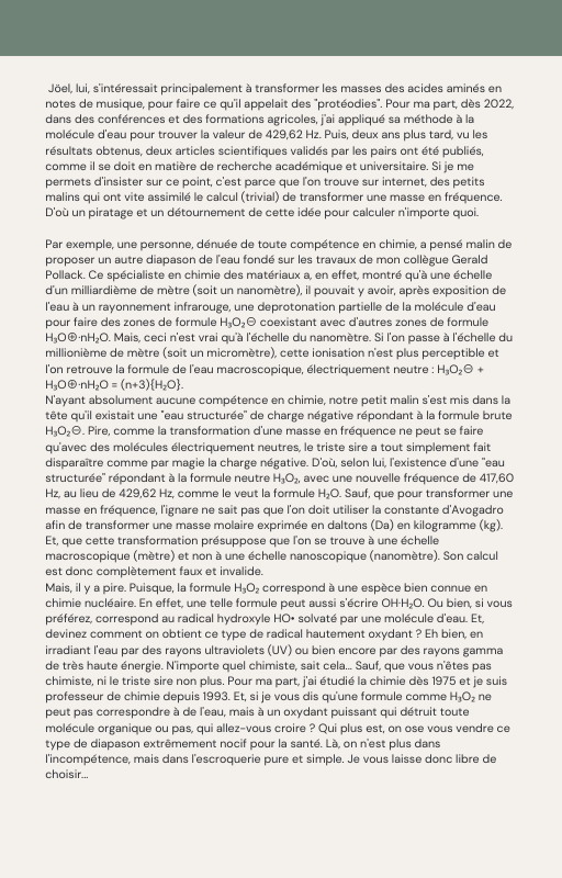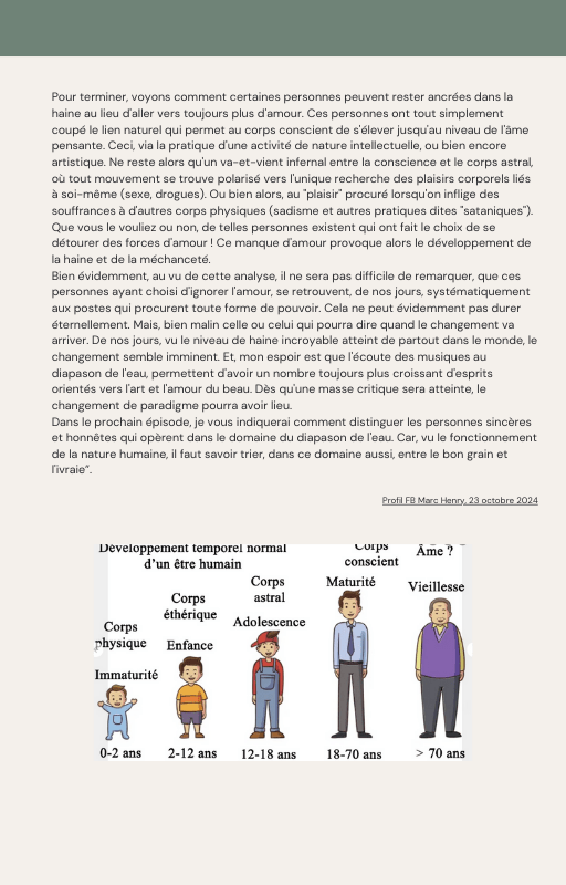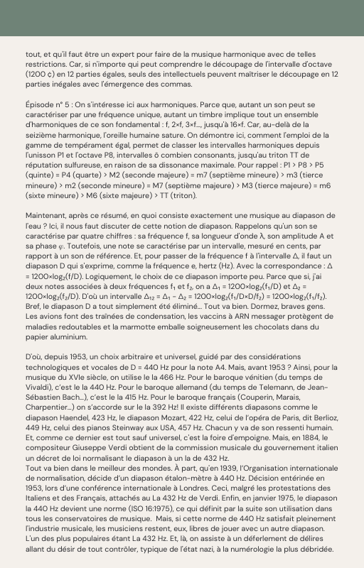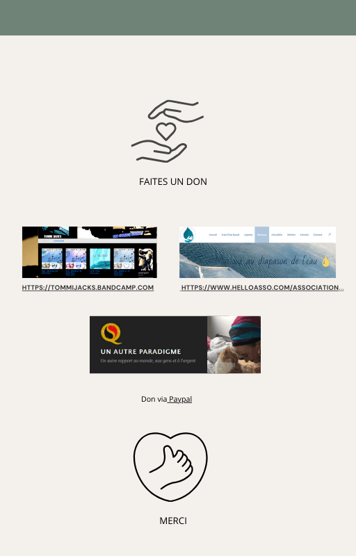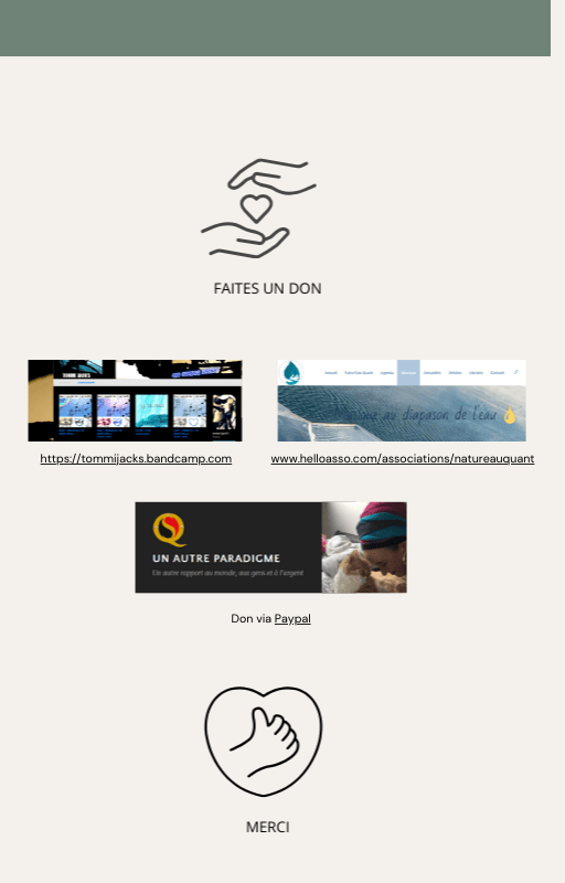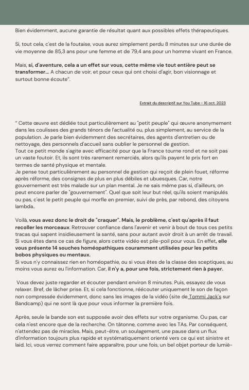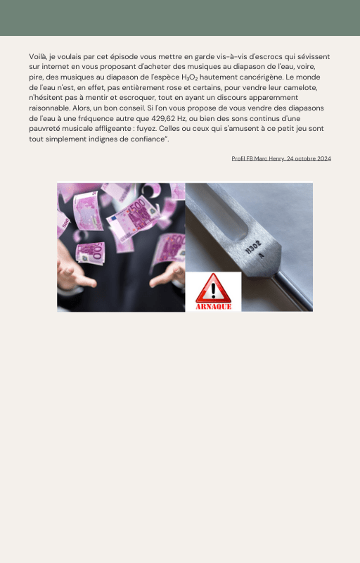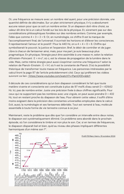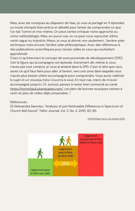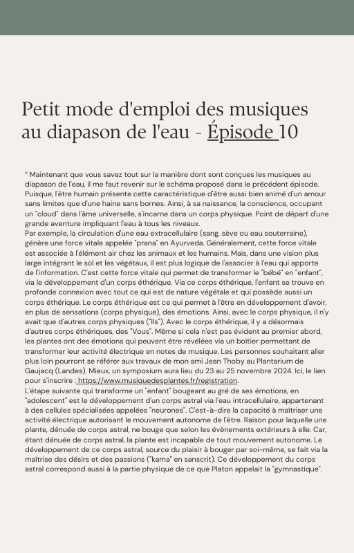 Pour rendre service à la communauté des Amis de l’eau morphogénique (le groupe privé Facebook de plus de 6000 membres où Marc Henry publiait quotidiennement) et parce qu‘intérieurement, j’étais animée à le faire, j’ai compilé les notes et les explications de Marc Henry et les ai mises en lien avec les musiques de Tommi sur la plateforme Bandcamp. En effet, avec le fil d’actualité, on s’y perdait et il devenait urgent de créer un document qui permette de centraliser les explications et les formules de Marc Henry à chacune des musiques de Tommi.